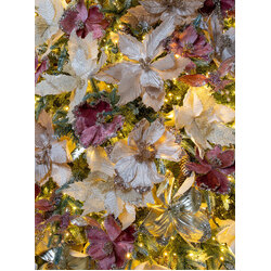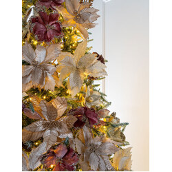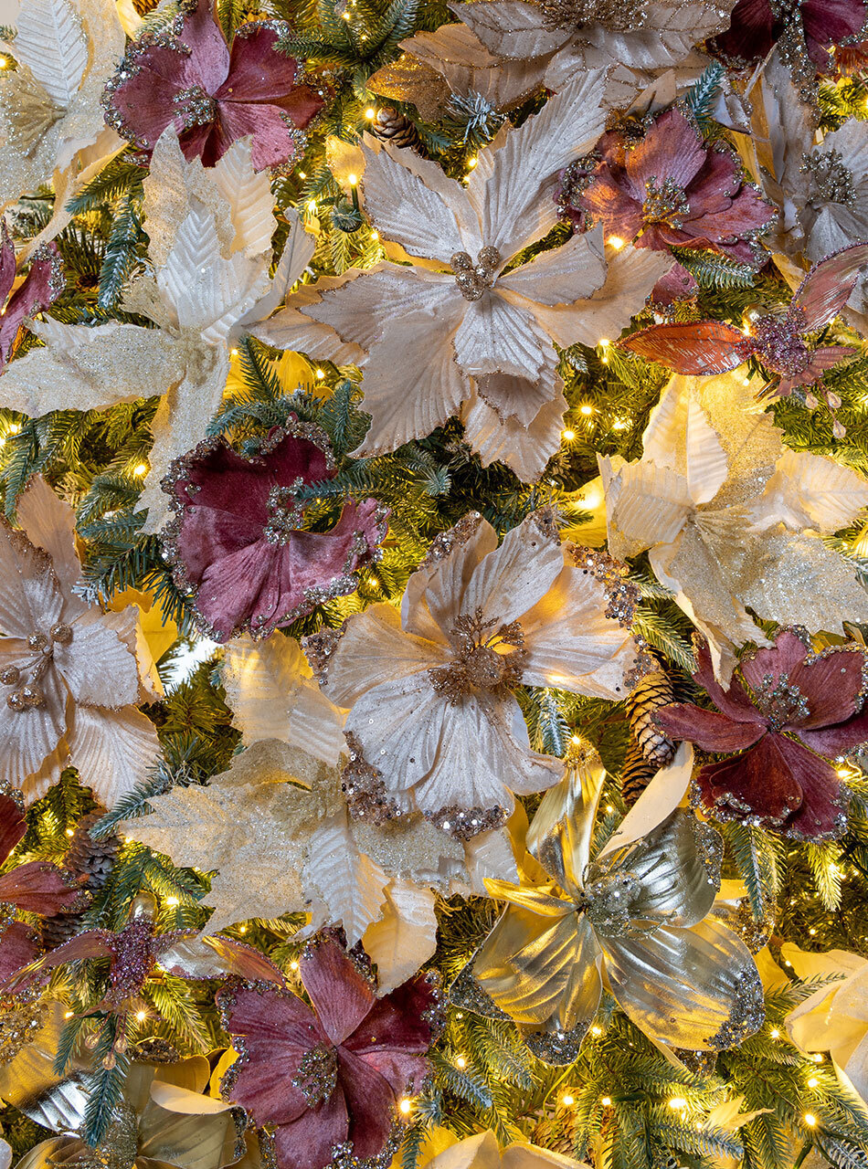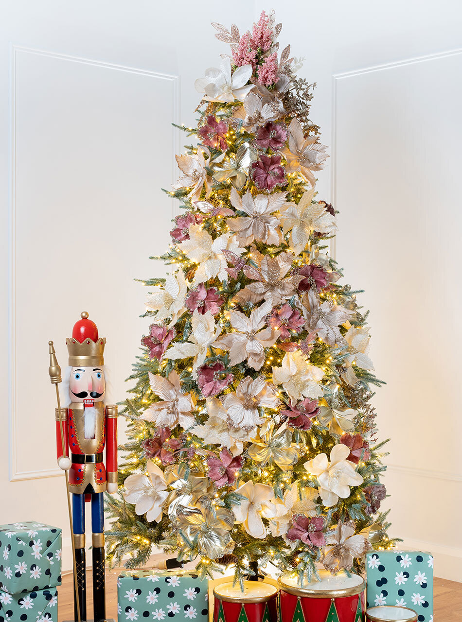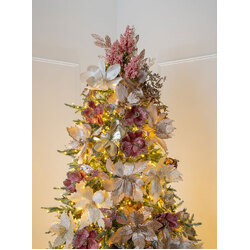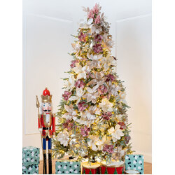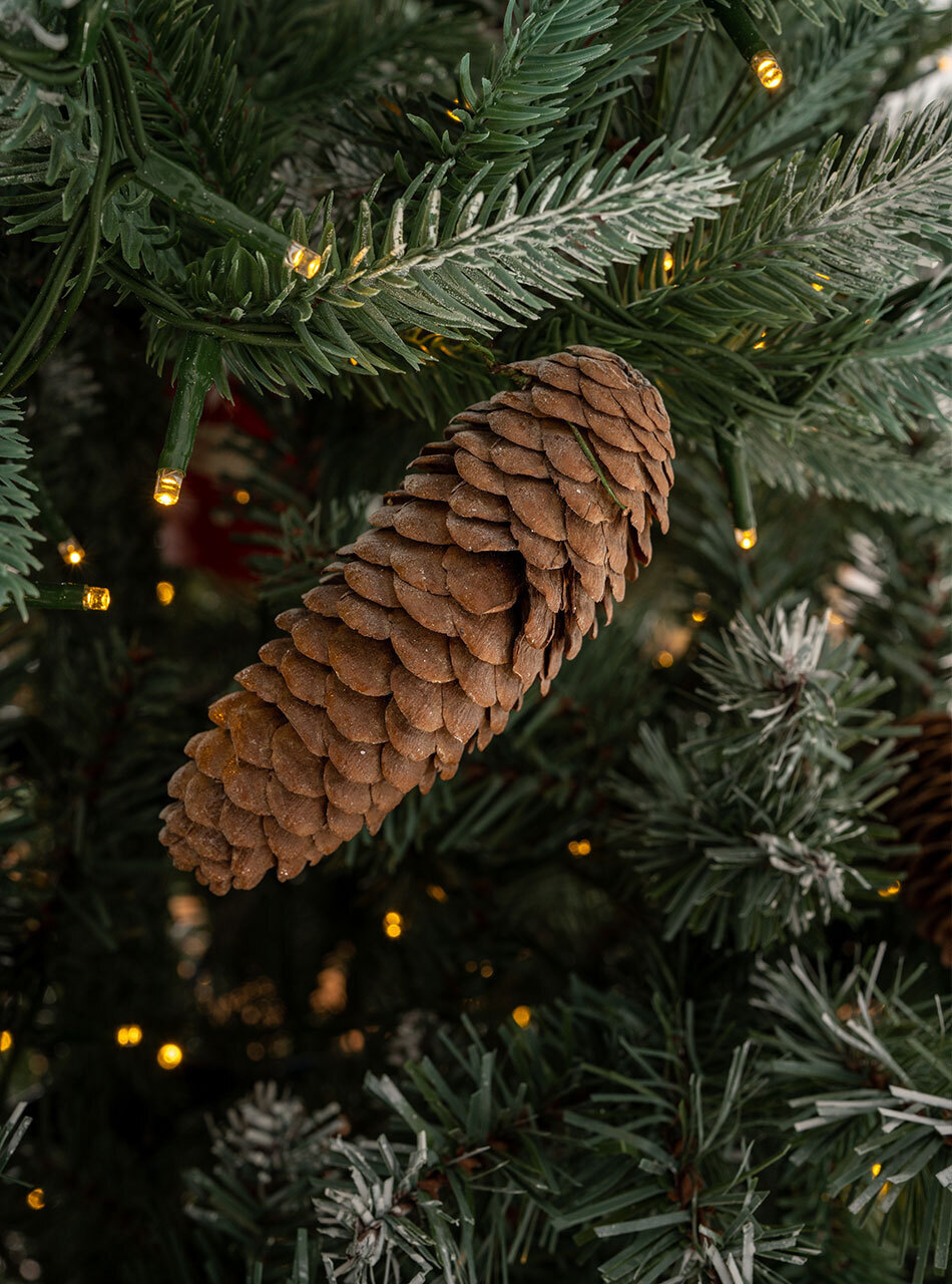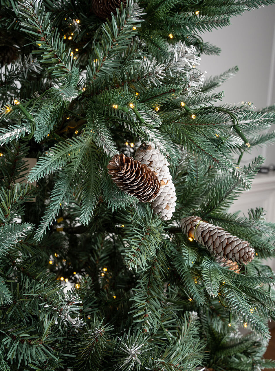 Being such a lush and full tree with the absolute maximum amount of lights any tree could have you have so many options with decorations. The Frosted tips and the real pine cones add nothing but value and poise to your tree. We have added golds, champagnes and ivory to this tree which gives a soft and whimsicle feel, but pinks, reds or any other colour works so well with this tree! The addition of floral picks and decorative baubles really makes this tree stand tall and adds so much to the incredible tree. Although if you're not feeling decorations this year don't worry! This tree is absolutely perfect with no decorations at all.